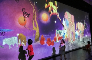デジタル社会のさまざまなな分野のスペシャリストから構成されているチームラボが手がけたアート作品を展示。どれも大型で体感型の作品は、遊園地のような華やかさと楽しさがある。会場いっぱいに映し出される映像の、ある部分に触れることによりその映像が変化、物語が展開していく。まるで動く絵本のようである。数種類用意された魚などの生き物の型紙に、おのおの自由にデザインする。その生物が映像に取り込まれ、映像の海の中を泳ぎ出す。 デジタルとアナログを見事に融合させた作品といえるが、用意された型紙の種類がもっと多いと自由度が増して面白くなりそうである。逆にいえば、アナログな感覚には、デジタルはまだまだ追いついていないと感じた。会場出口に飾られていた、参加者がデザインした魚たちの原画を見ると、人の発想力の多様性が非常に明快に伝わってくる。 デジタルの可能性やテクノロジーの進化には目を見張るものがあるが、アナログの感覚の広さや実感があってこそ、活かされるように思う。