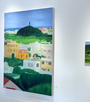 驚いたのは、展示作品の半分以上が黃色い人やコルク人形といったいつもの石垣のモチーフではなく、目の前に見える自然な風景画作品であったことだ。 目の前にある風景が自分に描かせた、と言っていたように、その風景の何かが石垣の心を引き付けたのだろう。石垣の作品は、黄色い人やコルク人形のように、石垣本人の中にあるファンタジックなビジョンや自身の感覚をキャンバスに視覚化するものであった。だが、今回の風景作品は、具体的な対象が自分の外にあり、それを見て描写するという今までとは違う制作の方向性を感じた。その所為か、絵の具のノリ具合がいつもと違って感じる。何度も塗り重ねられるうちに、絵の具の質が物質的に変化してるように見受けられる。主観と客観とがバランスを取りながら、石垣の新たな表現スタイルが生まれてきているようにも感じる。今後の展開に目が離せない。