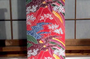 「古典柄 山頭桜波模様」帯は、朱の強烈な色が圧倒的な存在感で眼に飛び込んでくる。顔料で染められる「紅型」は、まるで絵画作品のような重厚な存在感を持つ。また非常に斬新に見える柄はすべて「古典柄」であることにも驚かされる。先人の、美しく斬新な柄。発想力とデザイン力、そして高度な技術力を、模倣し制作する事であらためて気づかされたと作者は語る。沖縄独自の「紅型」を、後世に継承し伝えていく意気込みを強く感じさせられた。