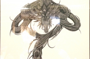 画業10年を迎えた大城の個展は首里観音堂という寺院で行われ、堂内には新作10点と二双の屏風絵も展示された。作品は大城の祖母から聞いた人の生き方、心の持ち様、社会に対しての考え方や教えを元に、ごく細密の点描で描画表現されている。その中で、今の力を出し切って観音像を描いたという『龍頭真如』は、出来上がってみると観音にはまだ達していない修行の身のように感じるという。描かれた観音と龍の目は閉じたままだ。それは、作者自身の中を問い、見つめ直しているという意味を持つ。画家としていまだ達していない今の自分自身と照らし合わせたこの作品の、本当の完成を今後見れる事を期待したい。