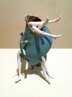 繭の様な、生き物の様な一見温かそうで柔らかそうな質、形態の作品は、すべて冷たく硬い陶磁器である。そのオブジェを後ろの方から見ていくと、アウトラインには顔を想像させる形を見つけることができたが、回り込んでみると顔は無く、穴があいている。その穴から数本の人間の足が飛び出している。その生き物が、人間を食べているのか?それともその生き物から足が生えてきているのか?これらの作品には様々な想像を膨らますきっかけが施されている。