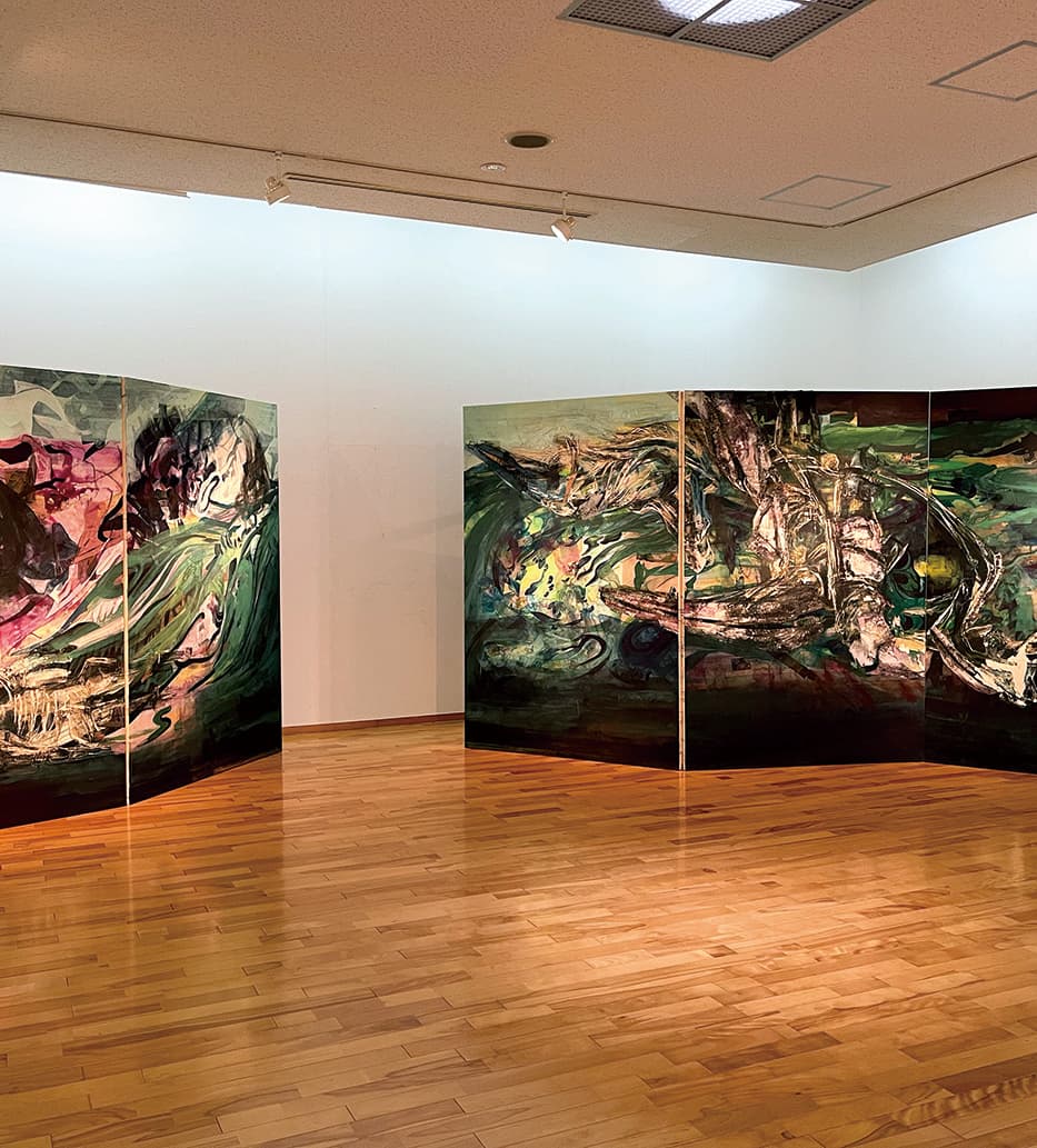 現代日本画を代表する内田の沖縄での初個展は、ダイナミックで迫力ある展示会であった。 「深い河=在」は、沖縄を取材し、沖縄独自の環境から得た内田の中に明確になった死生観の表れだという。河(水)の流れの形は、人物のシルエットに呼応し、その動きは、生命の証を表してるかのようである。それらが循環することで、この世界が存在するというように見える。丸木位里、俊からつながる墨による人体の表現も強い存在感を感じさせる。