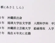 安里槙個展「after the rain.」(6/9~6/13沖縄県立芸術大学附属図書・芸術資料館第2展示室)沖縄県立芸術大学で油画を学ぶ安里槙は、形の無い光や、空気など体で感じる感覚を具現化する事をテーマとして制作している。モチーフとなる空、雲、水、植物などから作者が感じ取った感覚を、言語化するのではなくそのまま美しいと感じるように視覚表現する試み。全体的に柔らかな色味の作品が多く、心地よい空間であったが、コンセプトが明快なだけに、表現力に物足りなさを感じた。作者の感じている温度や湿度、触感などを見る側にもっと訴える表現力を高めていく事が今後の課題であろう。
